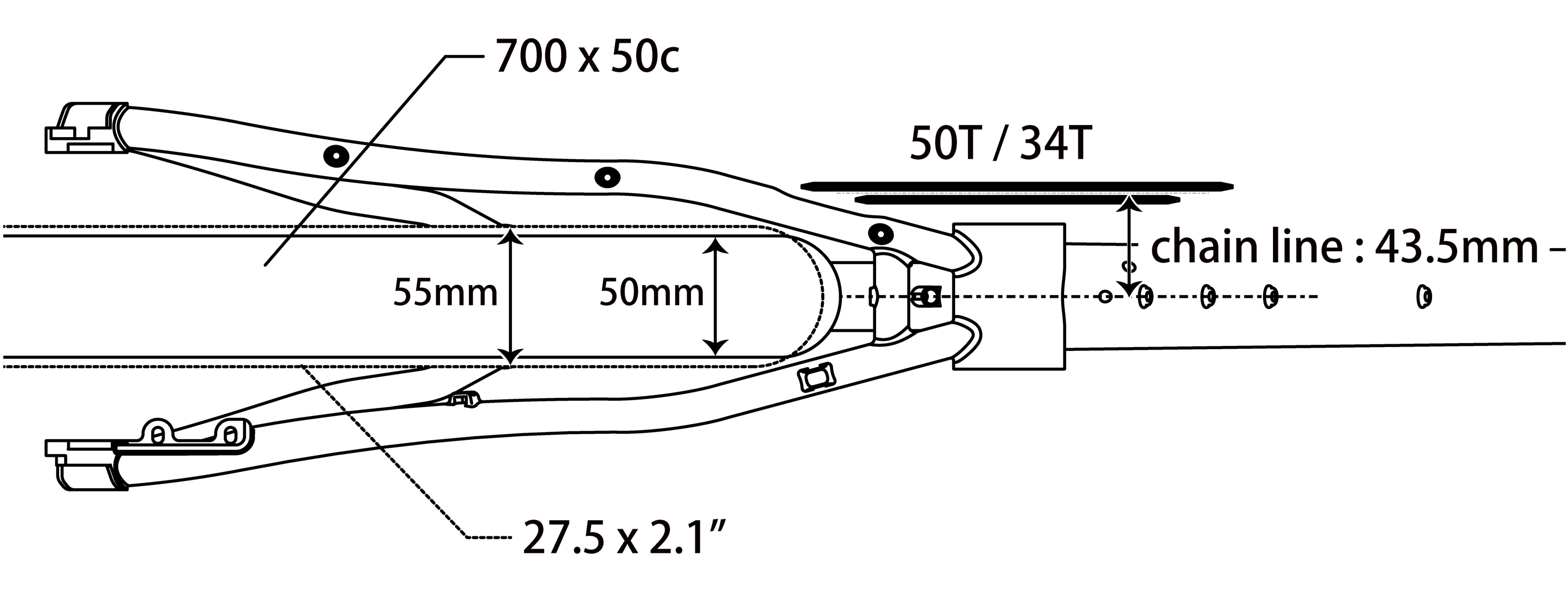 Tire clearance is up to 700x50c (tire width 50mm) or 27.5" (650B) x2.1 (tire width 55mm) (*The actual width of the tire may interfere with the frame depending on the rim width and the shape of the side blocks. The diagram on the left shows the maximum dimensions).