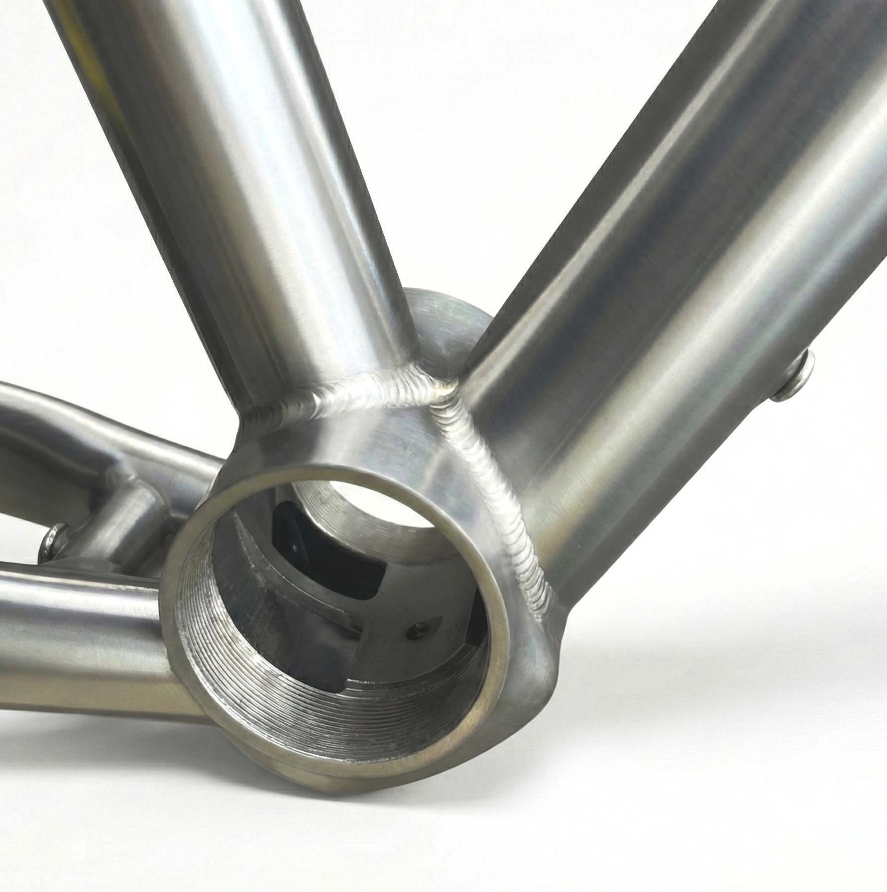 ケーブル類はダウンチューブ下面一箇所からフレーム内に導入、チェーンステーまで露出することなく内装できます。ダウンチューブのケーブルホールは、ケーブル本数に応じて穴数を変更することが出来ます。BBシェルにはケーブルハッチがあり、BBを取り外さずにケーブルをダウンチューブからチェーンステー側に通す事ができます。