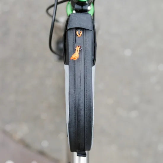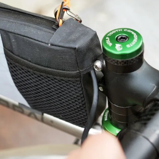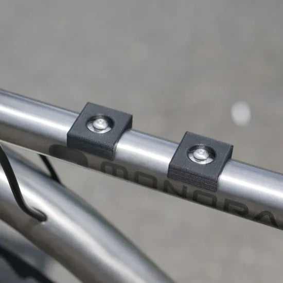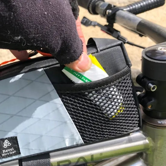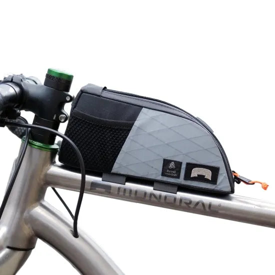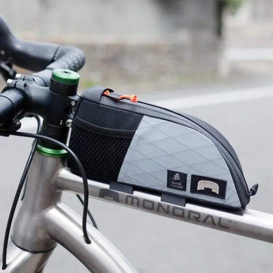 MONORALBIKESとRevel Work Craftの共同開発した、ネジ止め専用のトップチューブバッグ。バッグ自体にフレームを内蔵しているため、煩わしいコラムへのベルト巻き固定を用いずに自立2本のM5ネジのみで、スマートにフレームへ取り付けできます。フレームとバッグの間に傾きを防ぐスペーサー付属。